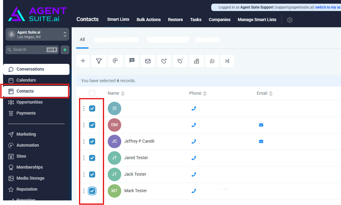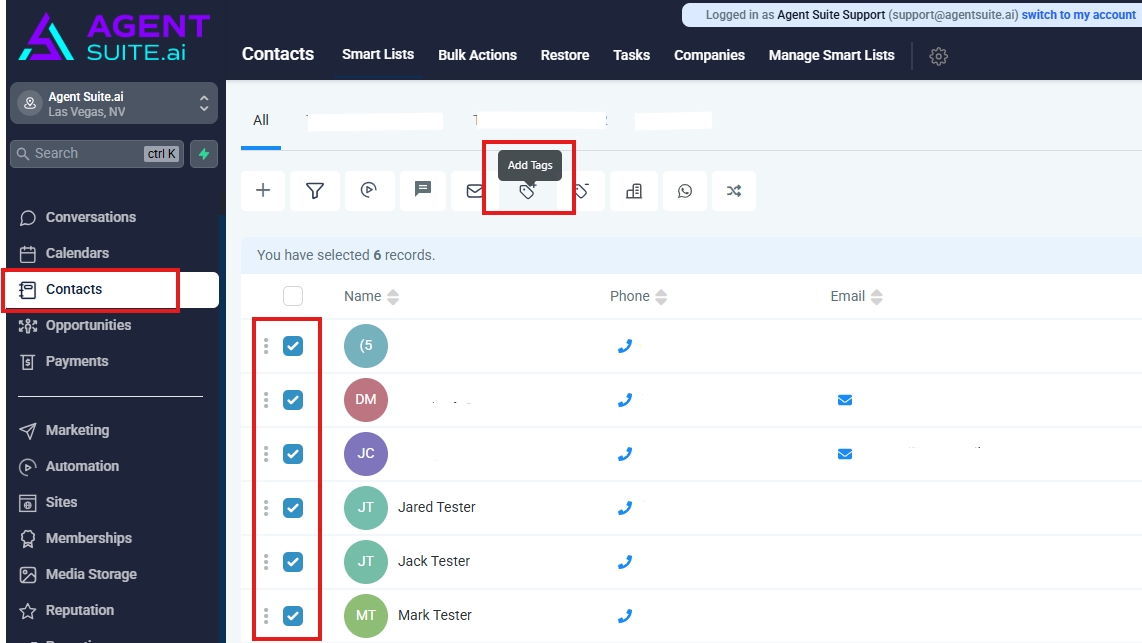 This section walks you through the exact process of applying tags to multiple contacts from the Contacts page.